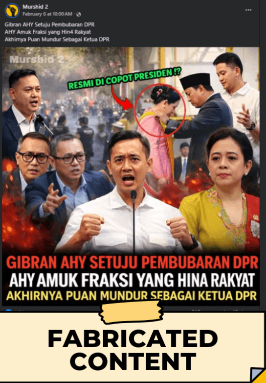 Ketiadaan Sumber Kredibel: Dilansir dari laman Turnbackhoax.id, tidak ditemukan laporan resmi atau pemberitaan dari media massa nasional yang kredibel mengenai kesepakatan pembubaran DPR oleh Gibran maupun AHY.